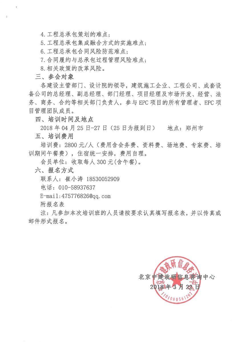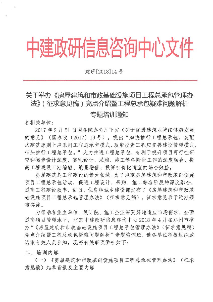 中建政研信息咨询中心于4月25日-27日在郑州举办“<房屋建筑和市政基础项目工程总承包管理办法>(征求意见稿)亮点介绍暨工程总承包疑难问题解析专题培训”、5月17日-19日在郑州举办“<招标投标法>大修、缩小工程招标范围暨行业难点问题和经典案例分析”,现将有关通知文件转发给你们。