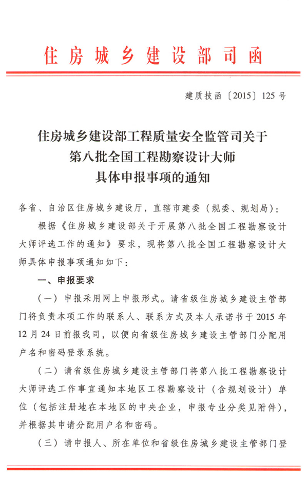 住房城乡建设部工程质量安全监管司关于第八批全国工程勘察设计大师具体申报事项的通知
