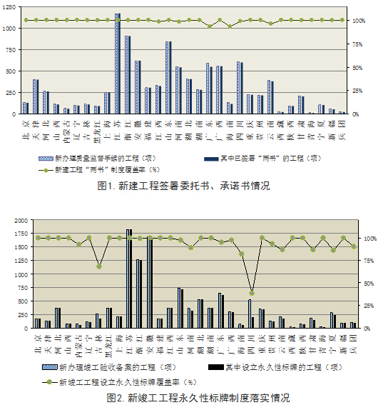 2016年1月,全国新办理竣工验收备案工程12027项,其中有11384项工程设立永久性标牌,覆盖率为94.65%,较上月下降2.69个百分点,江苏、安徽、湖北等18个省(区、市)覆盖率达100%;有10865项工程建立质量信用档案,覆盖率为90.34%,与上月基本持平,安徽、浙江、湖南等12个省(区、市)覆盖率达100%。