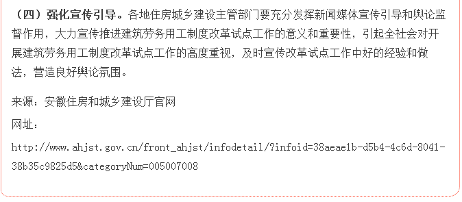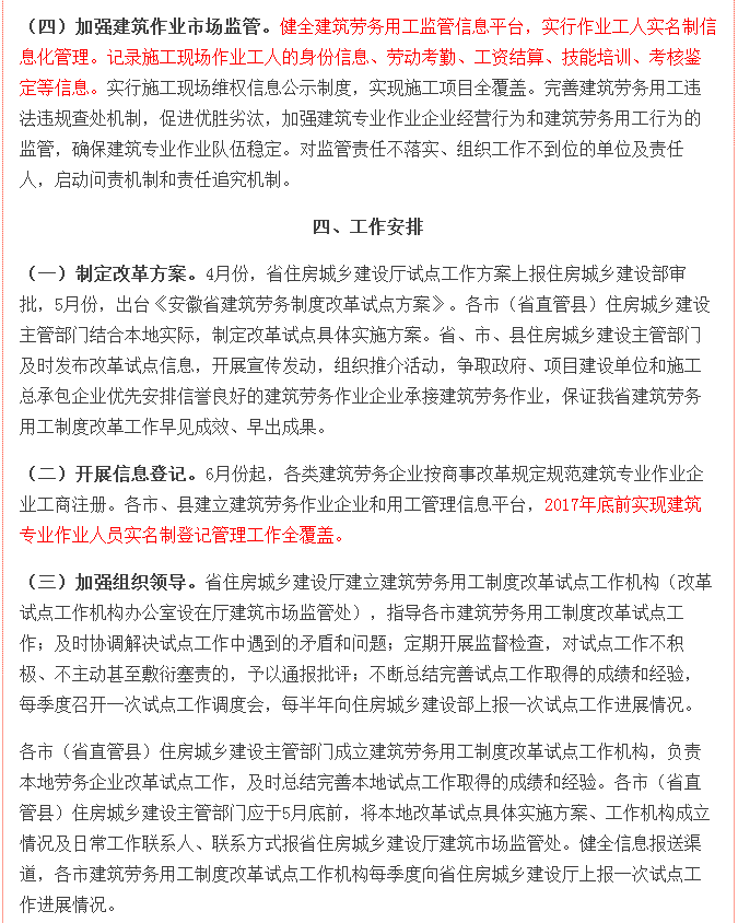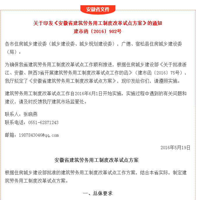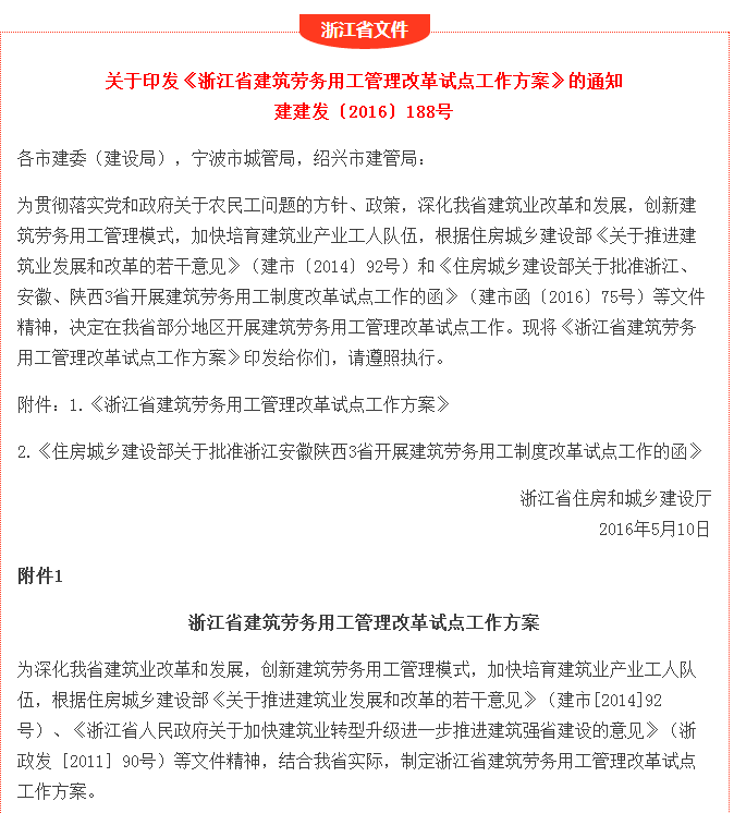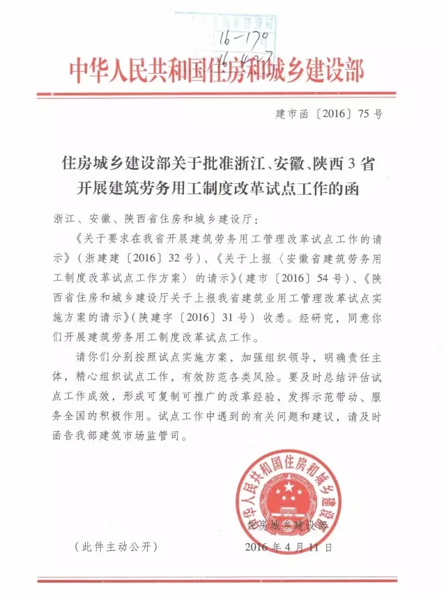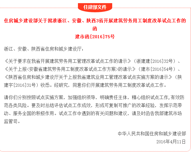 2016年4月11日,住房和城乡建设部批准浙江、安徽、陕西3省开展建筑劳务用工制度试点工作方案,随后安徽省、浙江省、陕西省陆续发布“建筑劳务用工制度改革试点方案”。