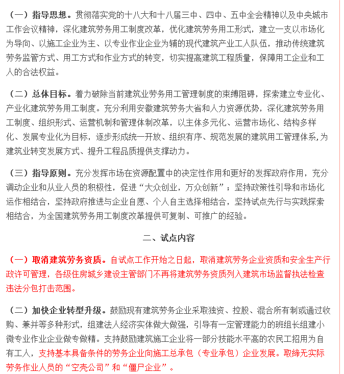 安徽省试点方案覆盖全省,力度非常大,并直接提出了“自试点工作开始之日起(即2016年6月1日),取消建筑劳务企业资质和安全生产行政许可管理,各级住房城乡建设主管部门不再将建筑劳务资质列入建筑市场监督执法检查违法分包打击范围。”。