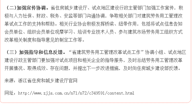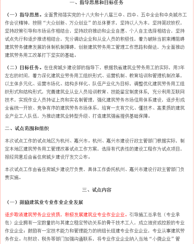 浙江省试点范围选择了杭州市、嘉兴市,提出:逐步取消建筑劳务企业资质,积极发展建筑业专业作业企业。