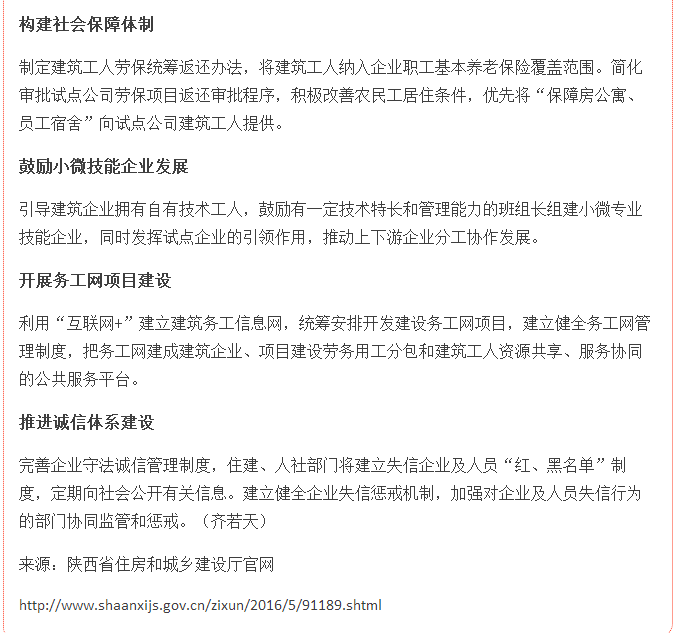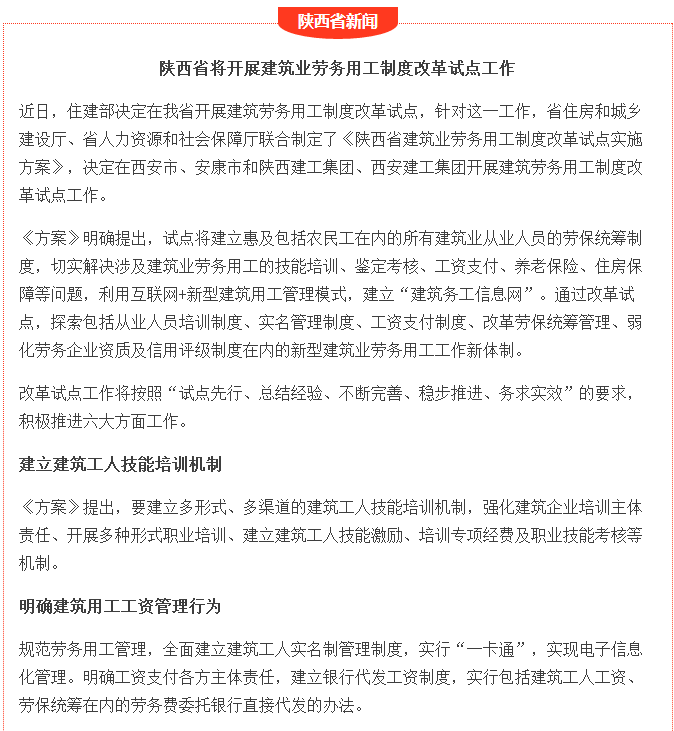 陕西省决定在西安市、安康市和陕西建工集团、西安建工集团开展建筑劳务用工制度改革试点工作,强调了:利用互联网+新型建筑用工管理模式,建立“建筑务工信息网”。通过改革试点,探索包括从业人员培训制度、实名管理制度、工资支付制度、改革劳保统筹管理、弱化劳务企业资质及信用评级制度在内的新型建筑业劳务用工工作新体制。