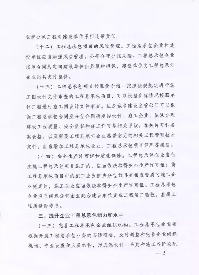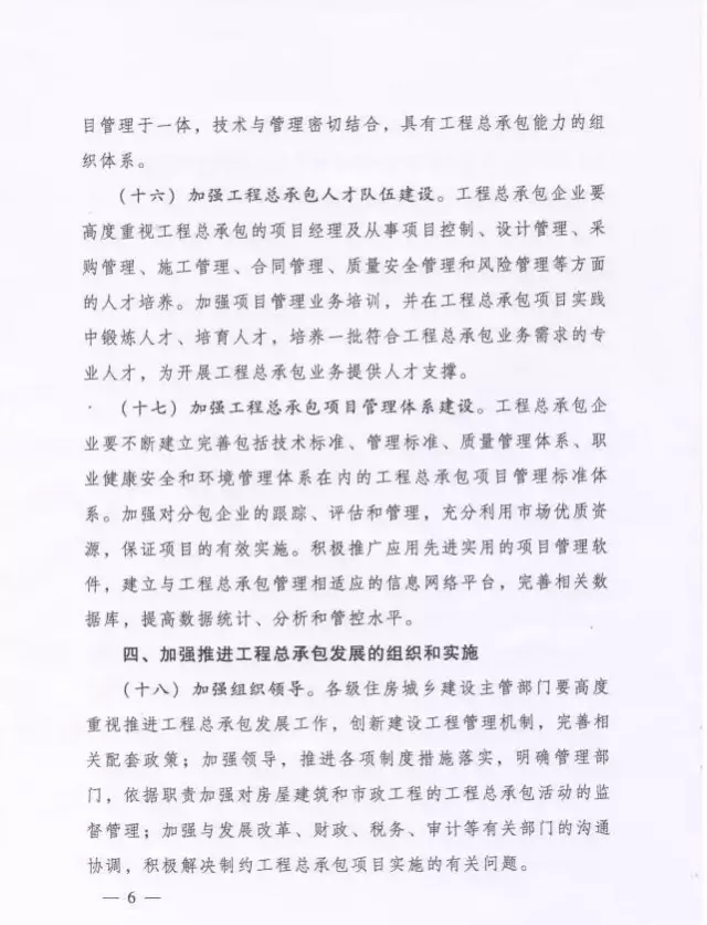 在发展过程中,市场上一度出现只要是具有相应资质都可参与总承包项目投标,但是这些单位在中标后,组织架构、人员配置和管理体系却无法满足业务开展的需要,项目无法顺利推进,同时给主管部门及一些建设单位造成了工程总承包模式的误解,所以《意见》指出:工程总承包企业除了要求具备相应资质外, 还需具有相应的财务、风险承担能力,同时具有相应的组织机构、项目管理体系、项目管理专业人员和工程业绩。同时,还需不断建立完善包括技术标准、管理标准、质量管理体系、职业健康安全和环境管理体系在内的工程总承包项目管理标准体系。