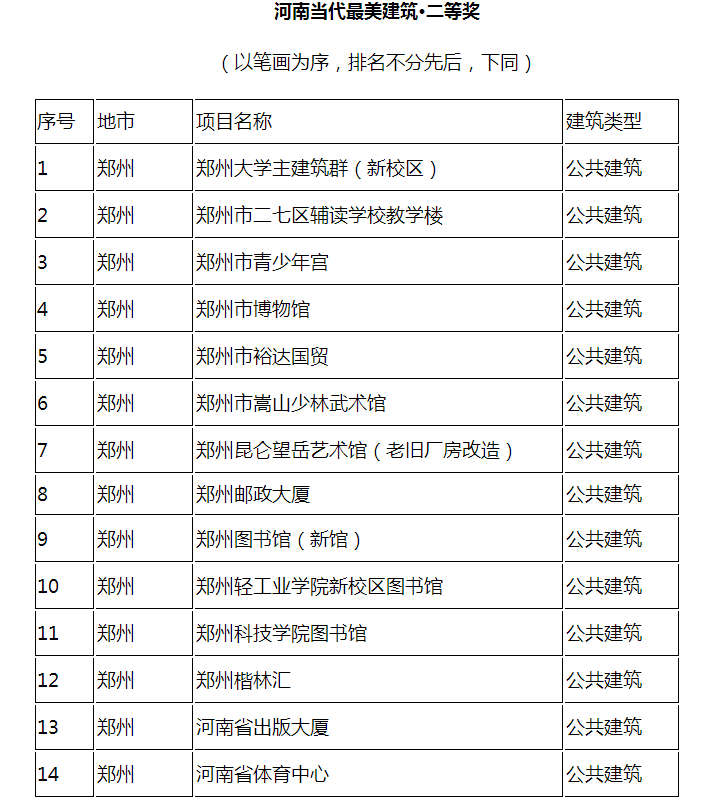 据介绍,本次活动共评选出125个获奖项目,郑州二七纪念塔等10个项目获得“河南当代最美建筑·一等奖(标志性建筑)”,郑州大学新校区建筑群等50个项目获“河南当代最美建筑·二等奖”;华北水利水电大学新校区建筑群等40个项目获“河南当代最美建筑·提名奖”;洛阳泉舜财富中心购物中心等25个项目获“河南当代最美建筑·网络人气奖”。