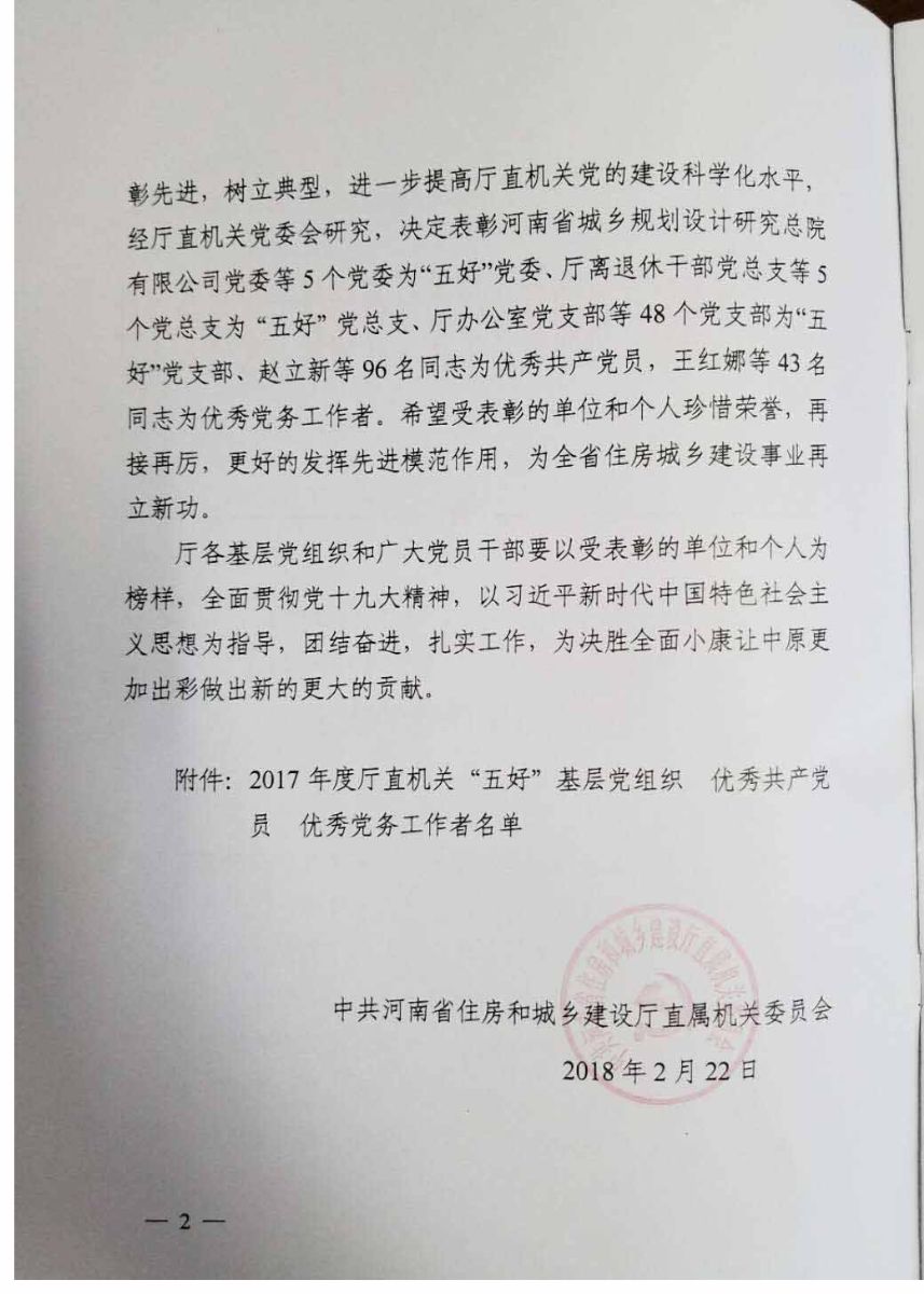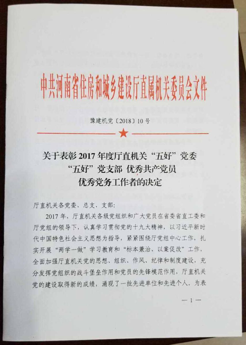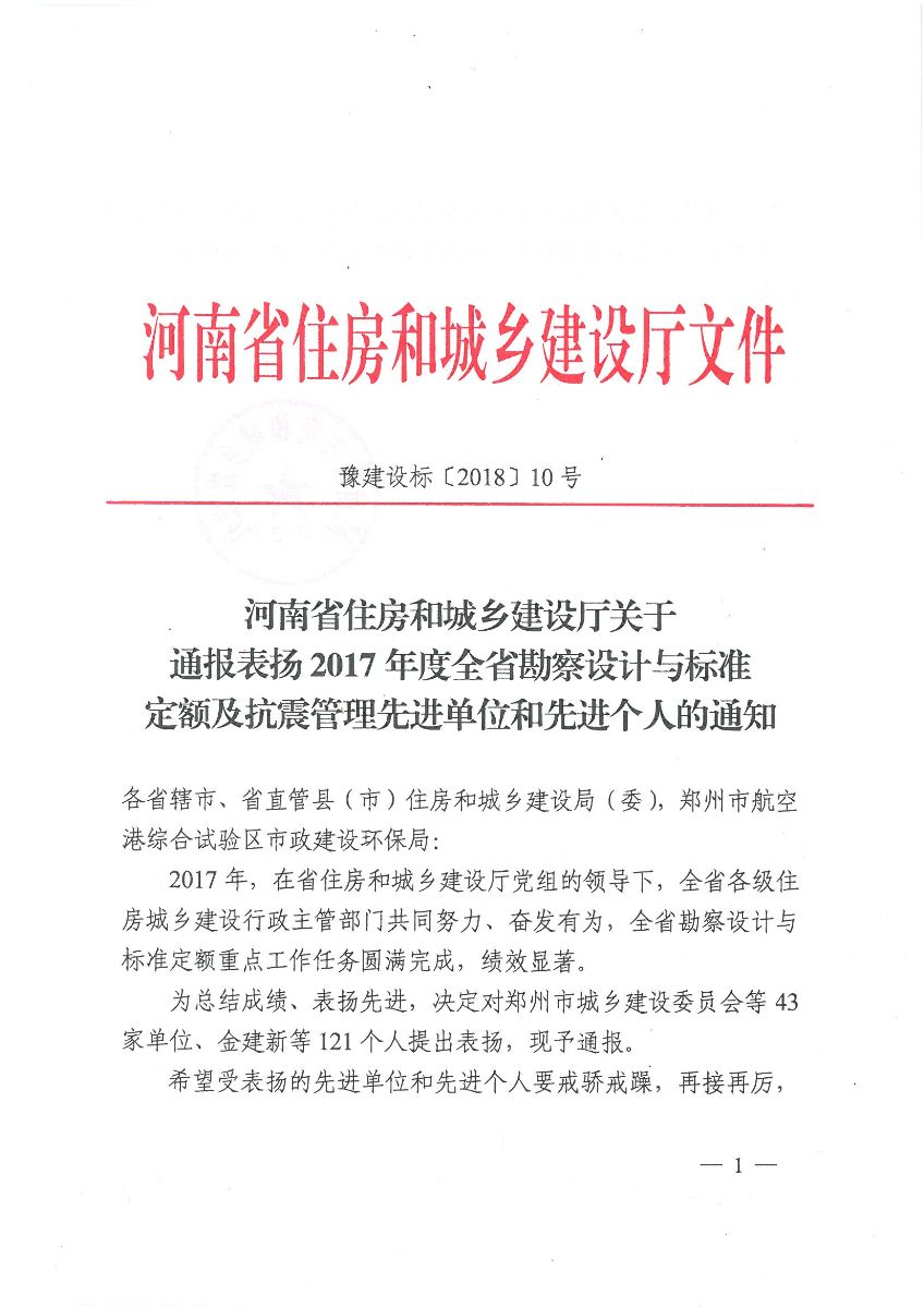 2017年是协会收获满满的一年,我会千金霞、刘海洋、赵盈睿等3人成为我省勘察设计行业先进个人,协会联合党支部被中共河南省住房和城乡建设厅直属机关委员会授予“五好党支部”称号,段俊霞同志被授予“优秀共产党员”称号。我会作为政府的助手、市场和会员单位的推手,充分得到省厅的肯定。