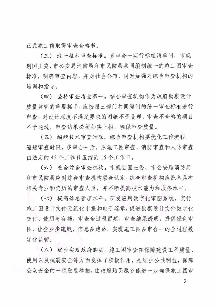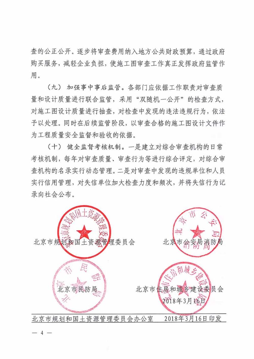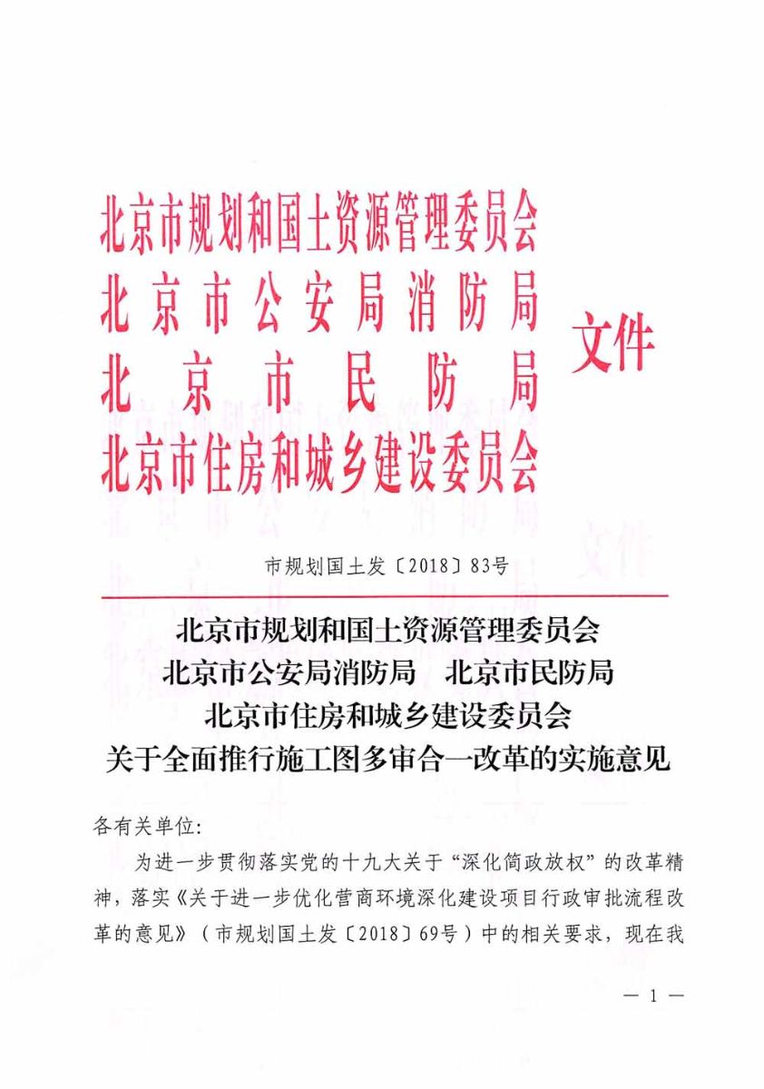 3月16日,北京市规划和国土资源管理委员会、北京市公安局消防局、北京市民防局、北京市住房和城乡建设委员会联合印发《关于全面推行施工图多审合一改革的实施意见》,明确北京市全面推行施工图多审合一改革。
