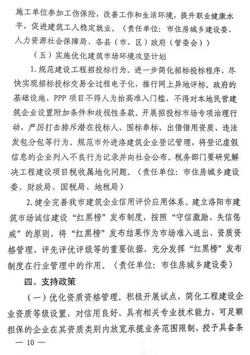 来源:洛阳市政府网 洛阳日报 解读: 日前,洛阳市印发《关于促进建筑业持续健康发展的实施意见》(以下简称《意见》),明确提出将加快建筑业供给侧结构性改革,推动洛阳市建成与中原城市群副中心城市地位相匹配的建筑业强市。 建筑业是洛阳市传统优势产业,关联50余个上下游产业。按照《意见》,洛阳市将综合运用政策引导、项目带动、产业支撑、市场培育、资金激励等手段,进一步优化产业结构、推进转型升级、提升发展质量、提高经济效益,促进洛阳市建筑业持续健康发展。 《意见》明确洛阳市建筑业发展目标:力争到2020年,全市建筑业总产值由2017年的1119亿元增加到1500亿元,建筑业产值增速保持10%以上,建筑业在国民经济中的支撑作用更加明显。建筑企业实力明显增强,建筑业特级资质企业由目前的6家增加到9家;年产值超50亿元的建筑企业由目前的2家增加到5家;年产值超10亿元的建筑企业由目前的10家增加到15家。 打造建筑业“航母” 建筑业发展,加快企业转型是基础。按照计划,洛阳市将着力培育大型建筑企业集团,整合洛阳市建筑企业力量,在河南三建、河南六建、国安集团、省安集团等企业中选取管理基础扎实、技术力量强、资金状况较优的企业为基础,联合中小企业,打造“航母”级企业或企业联合体。 同时,洛阳市住建部门将积极引导以市政龙头企业为牵头人,在洛阳市成立2个至3个特级市政企业,或由洛阳市政企业与具有市政特级资质的外地企业联合在洛组成企业集团,培养出具有品牌影响力的优选市政企业集团。此外,洛阳市还将支持洛阳城建院、规划院等投资咨询、勘察、设计、监理、招标代理、造价企业采取联合、重组、并购等方式,向全过程工程咨询企业转型。 《意见》还对建筑企业做大做强做优提出鼓励政策:鼓励建筑企业拓宽经营范围,鼓励企业拓展国内外市场,鼓励和培育优秀企业上市。 规范招投标交易 洛阳市住建委相关负责人表示,洛阳市将持续优化建筑市场环境,为建筑业发展提供更多服务保障。 ●推进企业合作联营 成立洛阳市建筑产业联盟,形成勘察、设计、施工、监理、装备制造、建材供应、金融服务等联动合作机制,实现资源整合、协同发展。支持洛阳市建筑企业与中央、外省、省内市外大型建筑企业组建联合体,参与省内重大工程项目施工,联合体享受本地骨干建筑企业相关政策。 ●规范建设工程招投标行为 洛阳市住建委将简化招标投标程序,尽快实现招投标交易全过程电子化,推行网上异地评标。政府的基础设施、PPP项目不得人为抬高准入门槛,不得对本地民营建筑企业设置附加条件和歧视性条款??拐型侗晔谐∽ㄏ钪卫硇卸?,严厉打击排斥潜在投标人、围标串标、出借借用资质、违法发包分包等行为。规范市外进洛建筑企业登记管理,将登记虚假信息的企业列入不良行为记录并向社会公布。 ●健全建筑企业信用评价体系 按照“守信激励、失信惩戒”的原则,建立洛阳市建筑市场诚信建设“红黑榜”发布制度,将“红黑榜”发布结果作为市场准入退出、资质资格管理、评先评优评级等的重要依据,充分发挥企业信用在行业管理中的作用。 实行“奖上奖” 《意见》还提出,洛阳市将出台更多优惠政策,促进建筑业更好更快发展。 ●优化资质管理 对信用良好、具有相关专业技术能力、可足额担保的企业在其资质类别内放宽承揽业务范围限制,试点授予具备条件的大型骨干建筑企业初、中级专业技术资格评审权和技能培训鉴定资格。 ●企业创新有奖 对取得特级总承包施工资质或获得国家级工程质量奖的施工企业,注册地政府应给予50万元奖励。对获得“鲁班奖”“中州杯”奖的项目,建筑单位对施工企业分别按含税工程造价的3%不超过1000万元、1.5%不超过300万元给予奖励,对监理企业分别按照监理服务费的5%、3%给予奖励。 ●总部迁入有奖 对将总部迁入洛阳市的施工总承包企业,按洛阳市招商引资奖励办法予以奖励,并优先满足企业用地、融资、人才保障等方面需求。对总部设在洛阳市、年产值超百亿元的特级建筑业和综合甲级设计企业,将企业总部办公、科研培训的建设用地规划为工业用地,按照工业用地性质予以安排。 ●讲信用享优惠 对评为“AAA”信用等级建筑企业,支持采用以银行保函形式缴纳投标保证金、履约保证金、质量保证金;新开工项目工伤保险费率由1‰调至0.8‰,连续两年以上未发生工伤事故的下调至0.4‰。