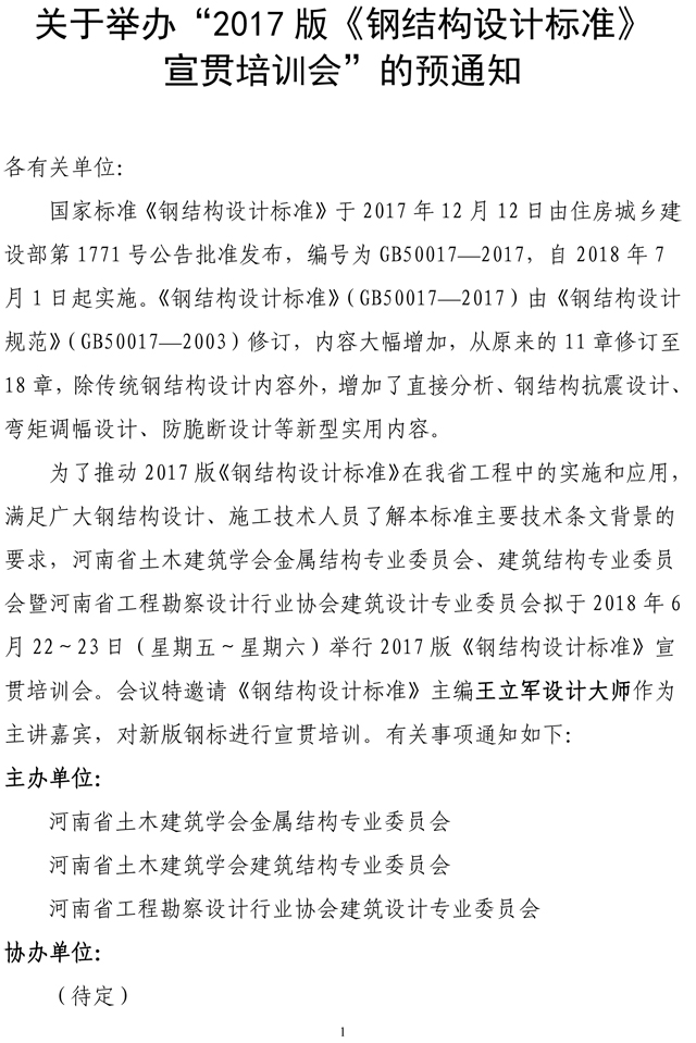 关于举办“2017版《钢结构设计标准》宣贯培训会”的预通知