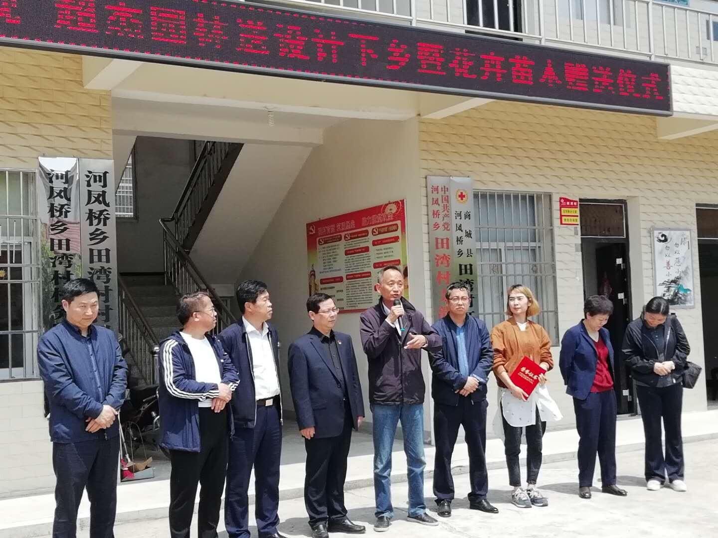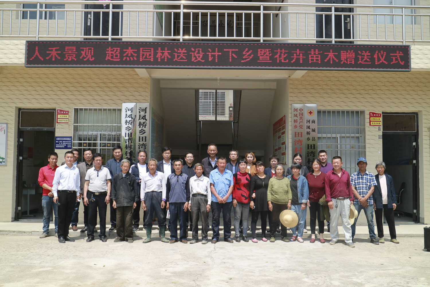 首先,郭风春副厅长一行在信阳市城市管理执法局局长张立英,商城县副县长程功言,商城县红十字会会长卢庆,商城县住建局穆正松局长以及河凤桥乡党委书记程欣然的陪同下,出席了“人禾景观超杰园林送设计下乡暨花卉苗木捐赠仪式”。人禾景观规划设计河南有限公司和河南超杰园林设计工程有限公司是在省住房城乡建设厅的组织发动下,响应党和国家的号召,积极关心支持田湾村的脱贫攻坚工作和美丽乡村建设。在3月底为田湾村进行义务园林化规划设计的基础上,今天又无偿捐献了1200株百日红,730株樱花,70斤的格桑花籽和月季等花卉苗木,总价值约6万元。仪式上,郭风春副厅长和程功言副县长为两个公司颁发了捐赠证书,并对他们的善举进行了勉励。在简短仪式后,郭风春副厅长和大家一起在田湾新村主干道边栽下了百日红。