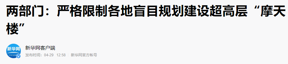 严格限制各地盲目规划建设超高层“摩天楼”,一般不得新建500米以上建筑,严格限制新建250米以上建筑。