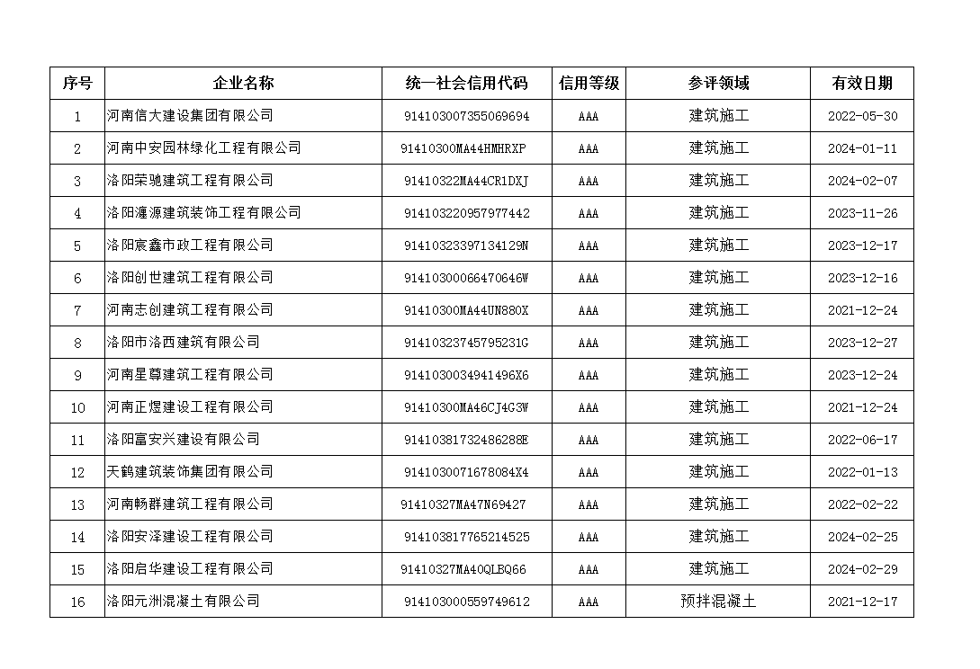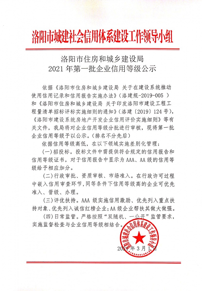 洛阳市住房和城乡建设局2021年第一批企业信用等级公示
