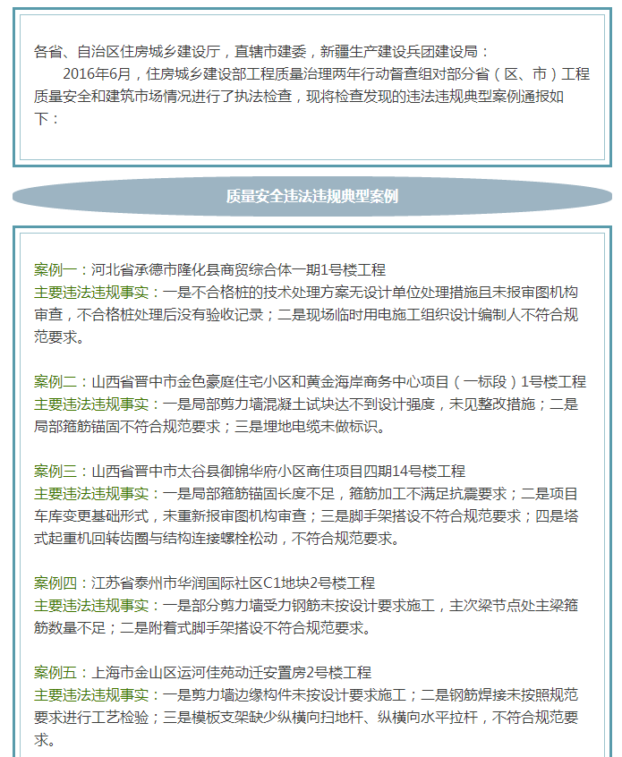 住建部最新通报2016年工程质量治理两年行动违法违规典型案例