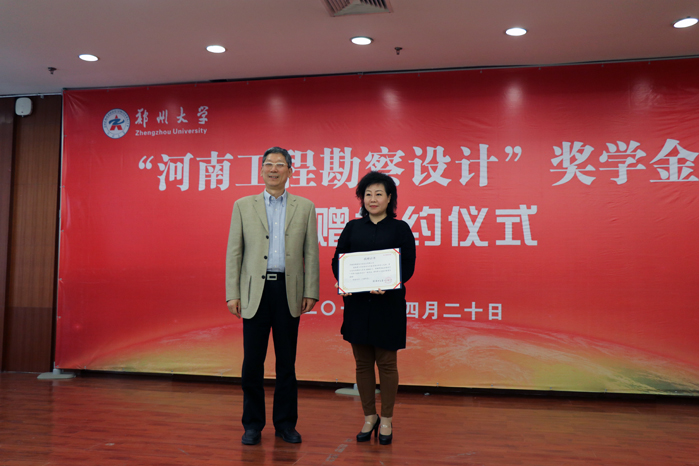 4月20日,“河南工程勘察设计”奖学金签约仪式在郑大校园举行。河南徐辉建筑工程设计有限公司是捐资企业之一,该公司副总经理任岩上台领取捐赠证书。