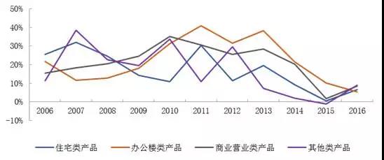 从产品类别上看,住宅、办公楼、商业营业类投资增长普遍放缓。