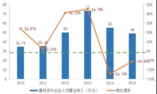 把行业从业人员数量考虑进去,情况更加令人担忧。建筑设计企业人均营业收入在2010-2013年一直处于增长态势,2014年这种乐观的情况被打破,开始呈现下降趋势,2014和2015年增长率均为负值,说明建筑设计行业人员数量过快增长,出现产能严重过剩现象。2015年建筑设计企业人均营业收入49万元,低于全国勘察设计行业平均水平(89万)。