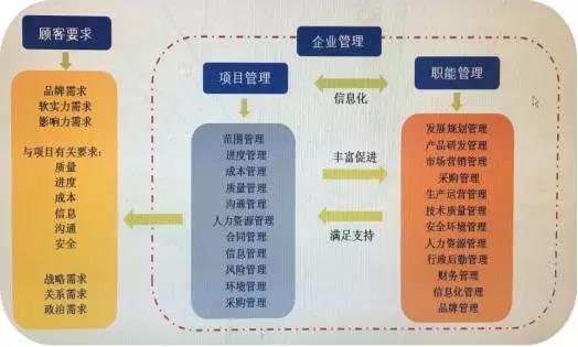 勘察设计企业管理一般包括项目管理和职能管理(如下图),项目管理的核心是满足顾客及相关利益方的要求,职能管理的核心目标是为项目提供支撑和支持,并约束项目实施活动,所以,质量管理不仅要关注项目,更要关注外部需求的变化以及后台管理(职能管理)的建设,形成高层管总、职能主建、项目主战的格局,才能更好地实现企业的战略目标。