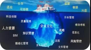 过去提到质量管理,就很容易只想到或看到表面上的勘察设计项目质量,而导致项目差错甚至失误的深层次原因没有被重视和挖掘。项目层面的问题只是冰山一角(如下图),构成支撑和支持作用的隐藏在冰山下面的企业文化、风险管理、科技创新、知识管理、人力资源管理、绩效考核等方面的问题以及结合业务特点的精细化管理制度不完善等问题,才是导致质量问题反复出现的深层次原因。