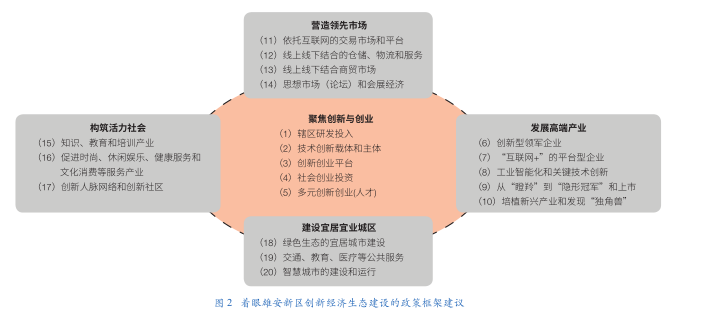 基于上述 5 大方面,对雄安新区即将开启的创新发展政策体系建设提出以下 20条框架性政策建议(图 2 ),并简要说明如下。