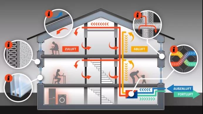 这是一栋最具现代感的房子的解剖图,其中为了居住证的生活需求,所展示几大关键技术要素:保温、门窗、气密性、无热桥和新风系统。