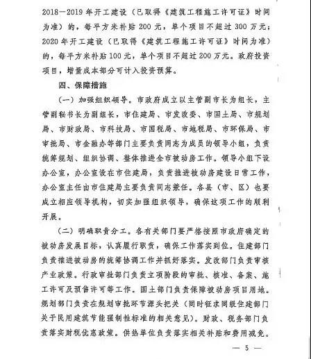 5. 给予财政补贴。对符合被动房节能标准的建筑项目,竣工后经专家评定,达到被动房建设标准,由市财政给予补贴。2018-2019年开工建设(已取得《建筑工程施工许可证》时间为准)的,每平方米补贴200元,单个项目不超过300万元;2020年开工建设(已取得《建筑工程施工许可证》时间为准)的,每平方米补贴100,单个项目不超过200万元。政府投资项目,增量成本部分可计入投资预案。