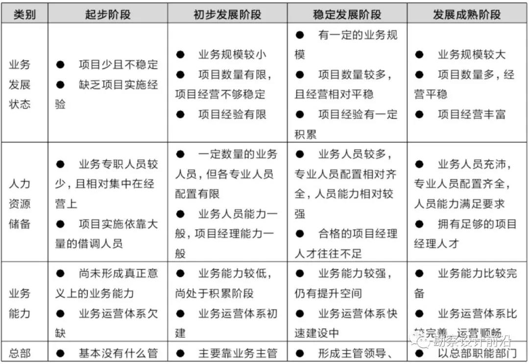 一般而言,勘察设计企业多元化业务的发展过程可以分为四个阶段:起步阶段、初步发展阶段、稳定发展阶段、发展成熟阶段。各个阶段的业务发展状态、人力资源储备、业务能力、总部管理方式、管控体系建设情况如下表1: