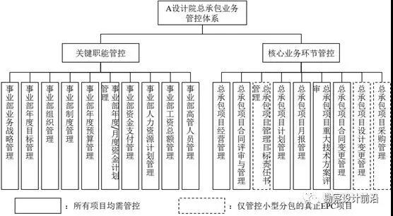 在业务管控事项的具体管理内容上,没有采取常规的“总承包业务部门内部执行与内部评审,之后提交院总部评审、审批”的形式。该形式更适合于业务比较成熟的情况下??悸堑?/span>A设计院当时的人力资源与业务能力现状,则设计了院总部与总承包业务部门共同完成项目的执行、评审、审批工作,一方面可以加快项目管理、审批的过程,另一方面则可以更充分集中全院的力量经营和实施总承包业务、把控总承包业务的风险。