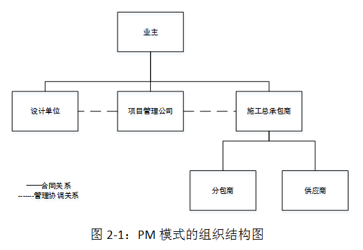 项目管理模式(PM: project management)是指工程项目管理企业接受业主的委托,按照合同的约定,代表业主对项目的组织实施进行全过程或若干阶段的管理和服务。其职责范围包括项目的决策阶段的可行性报告的编制和项目策划、招标代理、设计管理、采购管理和施工管理以及竣工验收等服务。PM合同是委托合同,接受委托的工程项目管理企业代表业主对工程建设的质量、安全、进度、成本、信息等要素进行管理和控制,按照合同约定收取一定的报酬和承担一定的管理责任。PM模式的组织结构图如下: