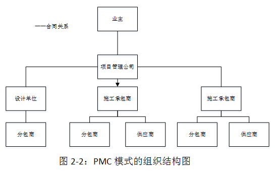 项目管理承包(PMC: project management contracting)模式下,业主直接与管理承包商签订合同,再由管理承包商和相关设计方和施工方签订合同。PMC模式的组织结构图如下: