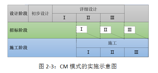 CM模式又称阶段发包模式(phased construction method)或快速轨道模式(fast track method)。最早起源于美国。这种模式下,业主委托具有施工经验的CM公司参与工程项目的设计阶段,为设计公司提供施工方面的经验,保证设计的可施工性。CM公司和设计单位是合作关系。这种模式的出发点是采用“边设计、边发包、边施工”的方式,尽可能的缩短项目的工期,当然,需要设计、招标和施工环节充分的衔接。CM模式的实施示意图如下: