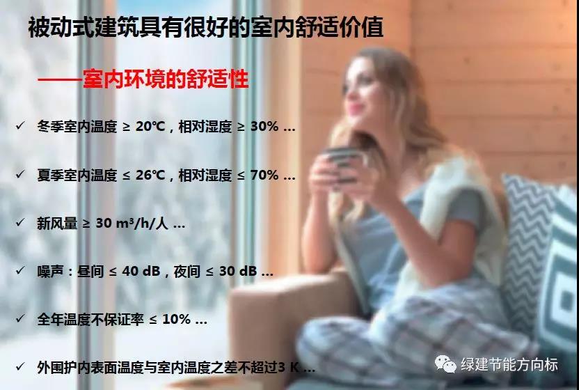 我们可以通过三个层次来深度学习一下被动房的那一系列学术指标。被动房第一维度的目标是室内舒适性,这个一般通过室内外的温湿度差异你体感就能够感受出来,但是用学术指标的话,就是下面这一系列的数值了。