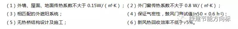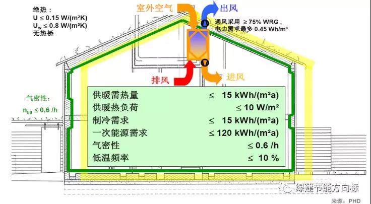 在保障第一维度目标实现的前提下,再用第二维度的能耗目标来约束,达到这两个条件的房子才能通过认证,成为合格的被动房。当然,能耗需求都是可以采用专业的软件计算出来(PHPP)转化为建筑本体的规划指标和建筑热工指标、气密性指标以及新风热回收效率等。下面这一组指标是一个经典的参考,但它绝不是被动房的标配。一个严谨的被动房设计是通过科学的模拟计算得来的,绝对不能像中国的建筑节能设计标准那样只通过规定一组热工设计指标就行的。所以我现在很奇怪,中国北方各省市纷纷出台的被动式低能耗居住建筑设计指标,乍一看那些指标都是照搬德国的经验值,太缺少科学的分析逻辑策略了,国人还把它们当做标准答案去建设被动房,实在是愚昧??!