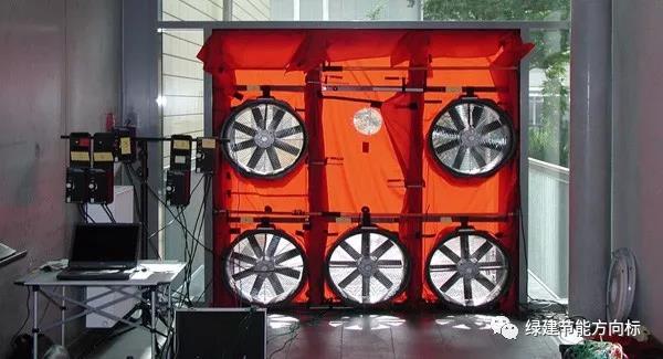 用一套鼓风设备在门口安装,通过抽风和鼓风来实现室内外一定的压差,计算房屋整体的气密性。我们给大家科普的不是外国人怎么怎么采用材料来做到被动房的严密性,而是他们在建筑整体气密性检测这一环节的严谨性。