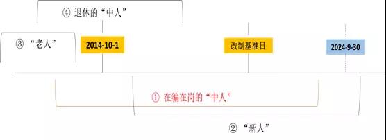 ①在职在编的“中人”,在2014年10月1日以前参加工作,改制基准日后退休。