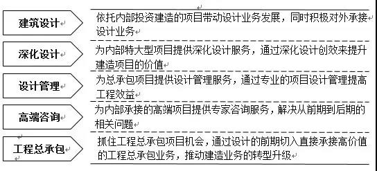作为施工企业下属设计院,我们认为主要有以下五个可能的业务发展方向,即建筑设计、深化设计、设计管理、高端咨询、工程总承包(如图1所示)。施工企业应当结合设计行业的特点和发展规律以及自身的实力水平,选择合适的业务发展方向,通过业务发展,吸引、留住关键人才,充分发挥设计与主业的协同效应。
