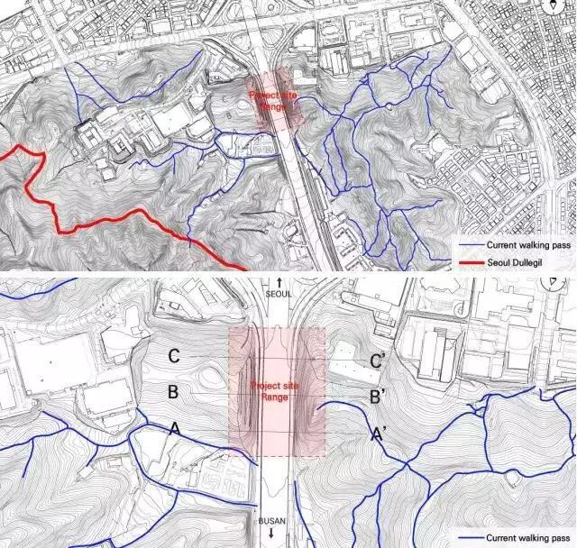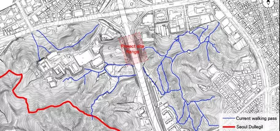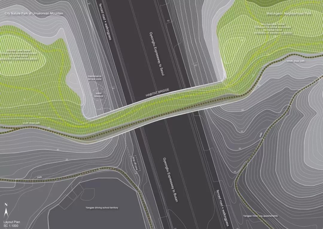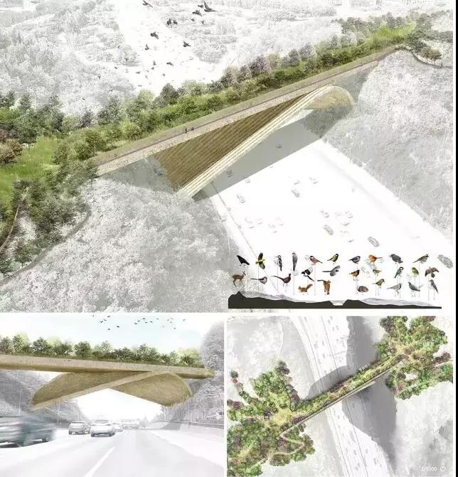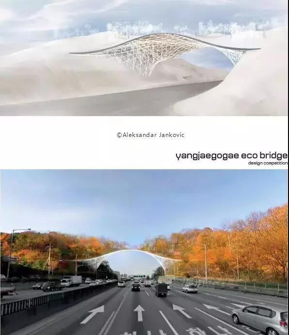 2017年4月,韩国首尔市政府推行了一项计划,即在京釜高速公路上修建一座生态步行桥,步行桥将作为2030年首尔公园绿地计划的重要一环,同时它也将在野生动物保护中作为野生动物的漫游路线,通过这种交通与生态的结合为市民创造便利。
