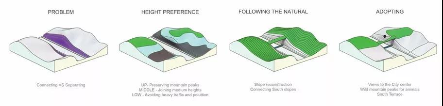 为了优先保护动物栖息以及活动场地,设计团队保有了原来的山峰,以此来创造出零人类打扰的区域。桥梁的结构性斜坡帮助保有了原来的山景。山间走道以人类和野生动物的关系区分不同的山景立面,使其形成了一个柔美的波浪形结构中心,并以此形成交通循环和休息的场所,同时还成为了整个设施最关键的一部分。