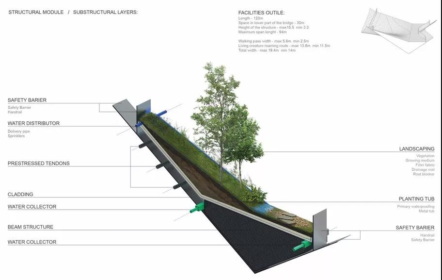 这座生态桥着重打造了内部的观赏体验,其倾向一边的连接方式减少了风力影响,并让更多区域直接接受太阳光照射,因此行人路过的时候能够体会到穿梭于山边的空间感。在桥上,行人可以纵览全景也可以观察局部细节。