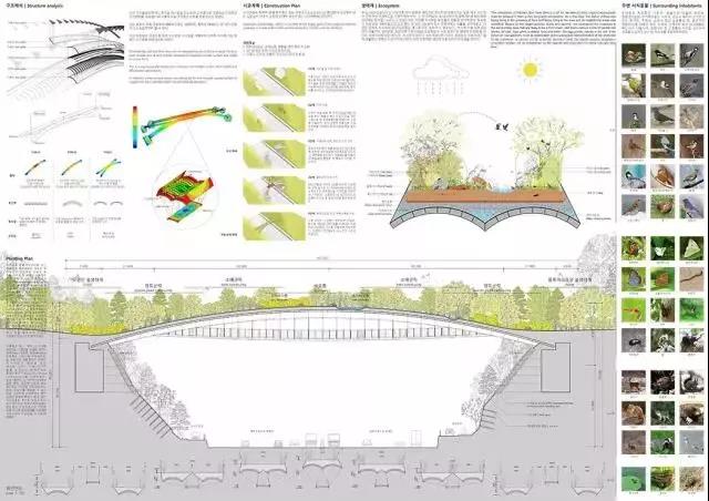 “桥梁的景观是对韩式花园自然、不拘小节、简单且不受约束特征的呼应”,获奖团队解释道,“整个链接结构的建筑语言呼应了传统韩式花园庭院中自然的韵律,以此来让人群享受周边花园景色。”
