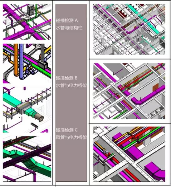 1)传统CAD技术在施工图阶段效率低下,易出现管线碰撞,设计漏洞等;而BIM技术运用设备管线提前绘制模拟成型,解决了机电工程管线综合和碰撞检测,可直观有效地指导机电管线安装,并有效实现与各个专业之间的配合,降低施工现场发现错误整改拆修的成本投入,开启设计优化模式。