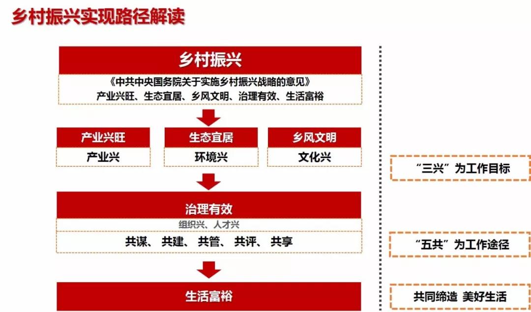 2018年1月,中央一号文件提出了“产业兴旺、生态宜居、乡风文明、治理有效和共同富裕”五项任务。为我们明确了乡村振兴的三大主要目标:产业兴(产业兴旺)、环境兴(生态宜居)和文化兴(乡风文明),并且指明了实现途径——治理有效,最终实现共同富裕。