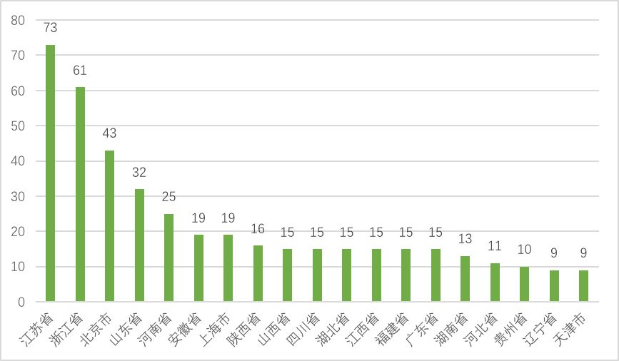 其次是:山东?。?2家)、河南?。?5家)、安徽?。?9家)、上海市(19家)、陕西省(16家)、山西省(15家)、四川?。?5家)、湖北?。?5家)、江西省(15家)、福建?。?5家)、广东?。?5家)、湖南?。?3家)、河北?。?1家)、贵州?。?0家)、辽宁?。?家)、天津市(9家)。