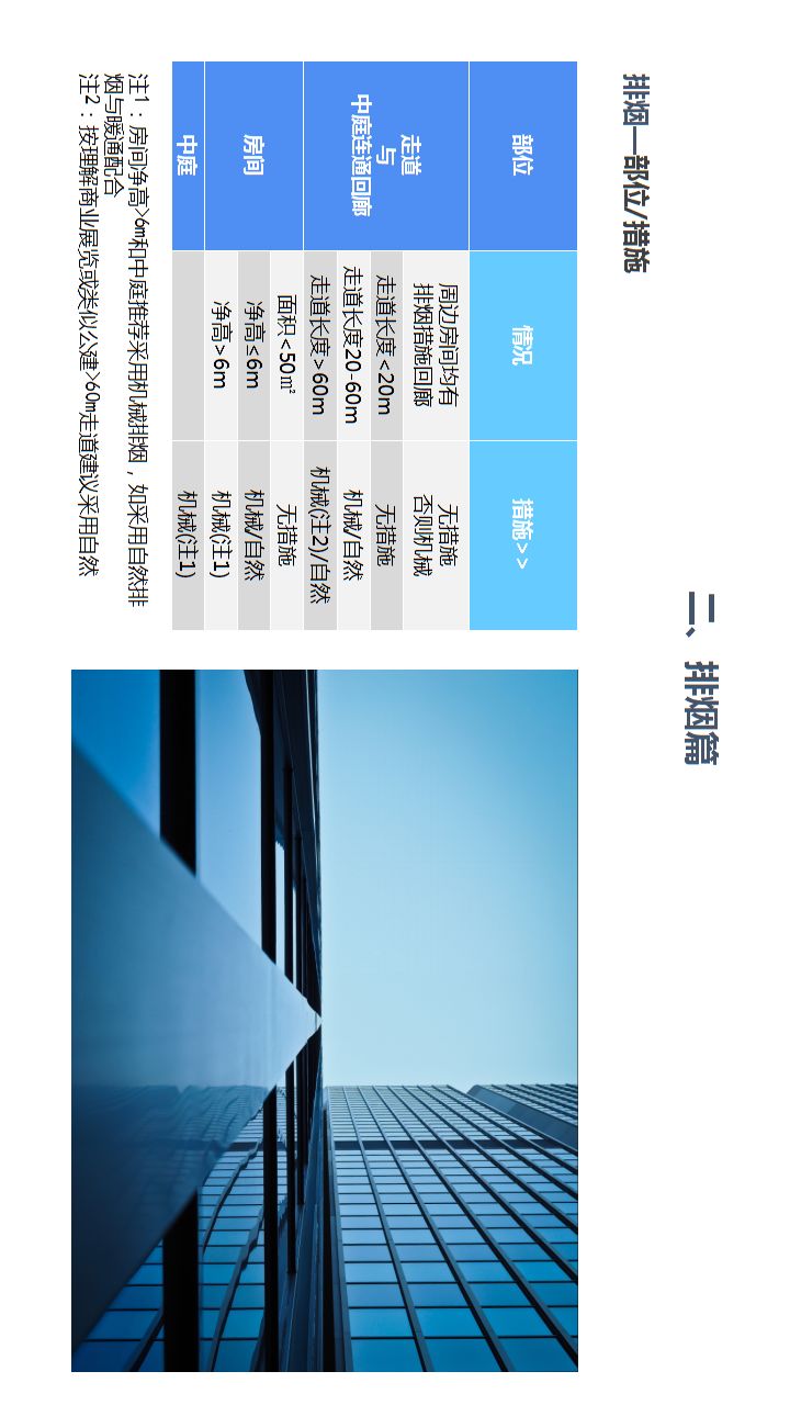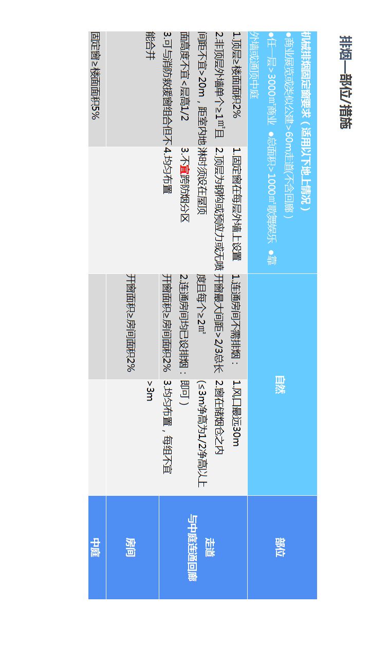 防排烟有三种措施等级,新规着重强调了自然防排烟的重要性,机械防排烟是终极手段。