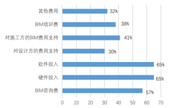 软硬件投入是普遍BIM费用支出项,65%的项目均有此部分开支,在没有软硬件支出的BIM项目中,多为委托第三方咨询机构进行BIM管理。