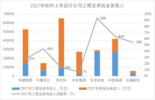 细分行业中,工业勘察设计企业发展工程总承包业务较早,取得成绩较好。2017年,东华科技工程总承包业务收入贡献率高达93%,中国海诚、永福股份业务结构中总承包收入占比均高于50%。