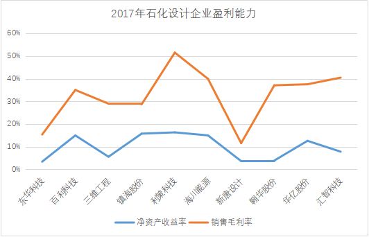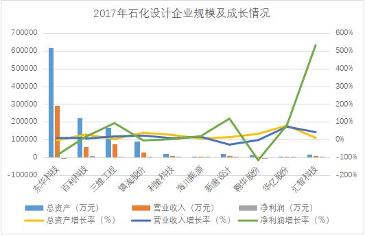 在主板、中小板、创业板、新三板上市挂牌的石化勘察设计企业共有10家。东华科技2017年总资产规模最大,但其同期的净利润却是亏损。从规模发展速度看,石化行业设计企业分化较严重,2017年,净利润增长速度最快的汇智科技同比增速高达531%,而东华科技、翱华股份净利润较前一年均出现了同比下滑。