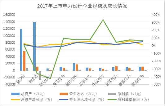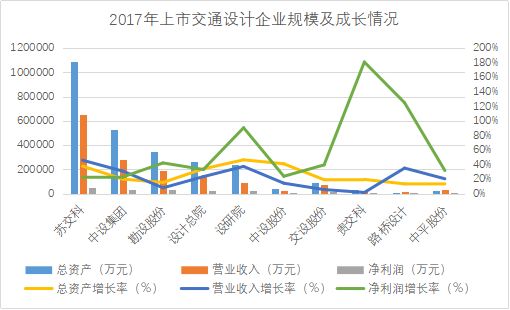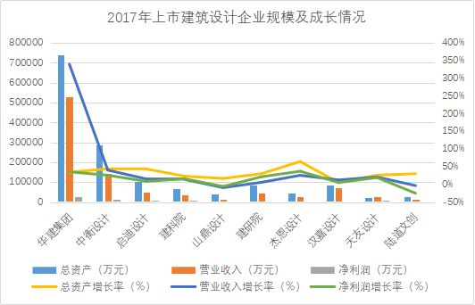 在主板、创业板、新三板上市挂牌的建筑勘察设计企业共有43家?;攀切幸盗菲笠?,2017年总资产超过74亿元,实现营业收入约53亿元,净利润约2.6亿元,同比增速34%、340%和35%。就成长能力3项指标综合来看,杰恩设计表现比较突出,总资产、营业收入和净利润同比增速约为65%、26%、37%,规模扩张速度略领先于同行企业。