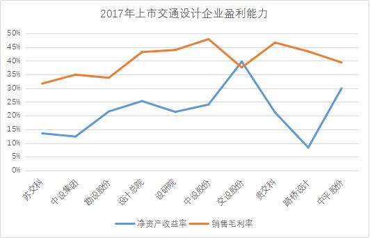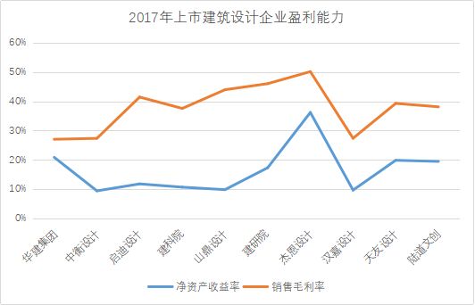 从盈利能力来看,上市建筑设计企业的净资产收益率位于10%到40%区间,销售毛利率位于30%到50%区间。2017年,杰恩设计的盈利能力表现最优,凭借50%的销售毛利率和36%的净资产收益率,居于同类上市企业领先水平。