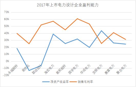 从盈利能力来看,电力设计企业净资产收益率差异较大,除易世达、联动设计为负值外,其他电力设计企业净资产收益率处于20%到40%区间,销售毛利率约在25%到60%区间。盈利表现相对好的企业包括国孚电力、交联电力,2017年分别实现了同行业的最高销售毛利率和最高净资产收益率。