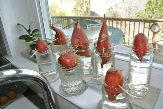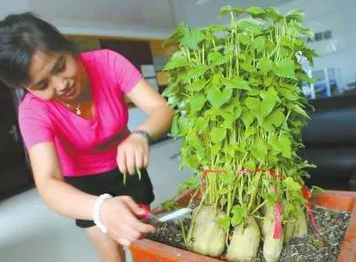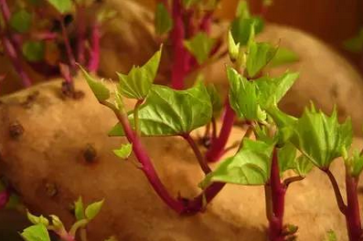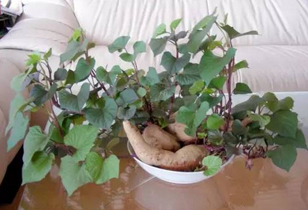 注:如果您会一点造型设计,便可以来个红薯盆景,剪下的叶子可以炒菜吃。